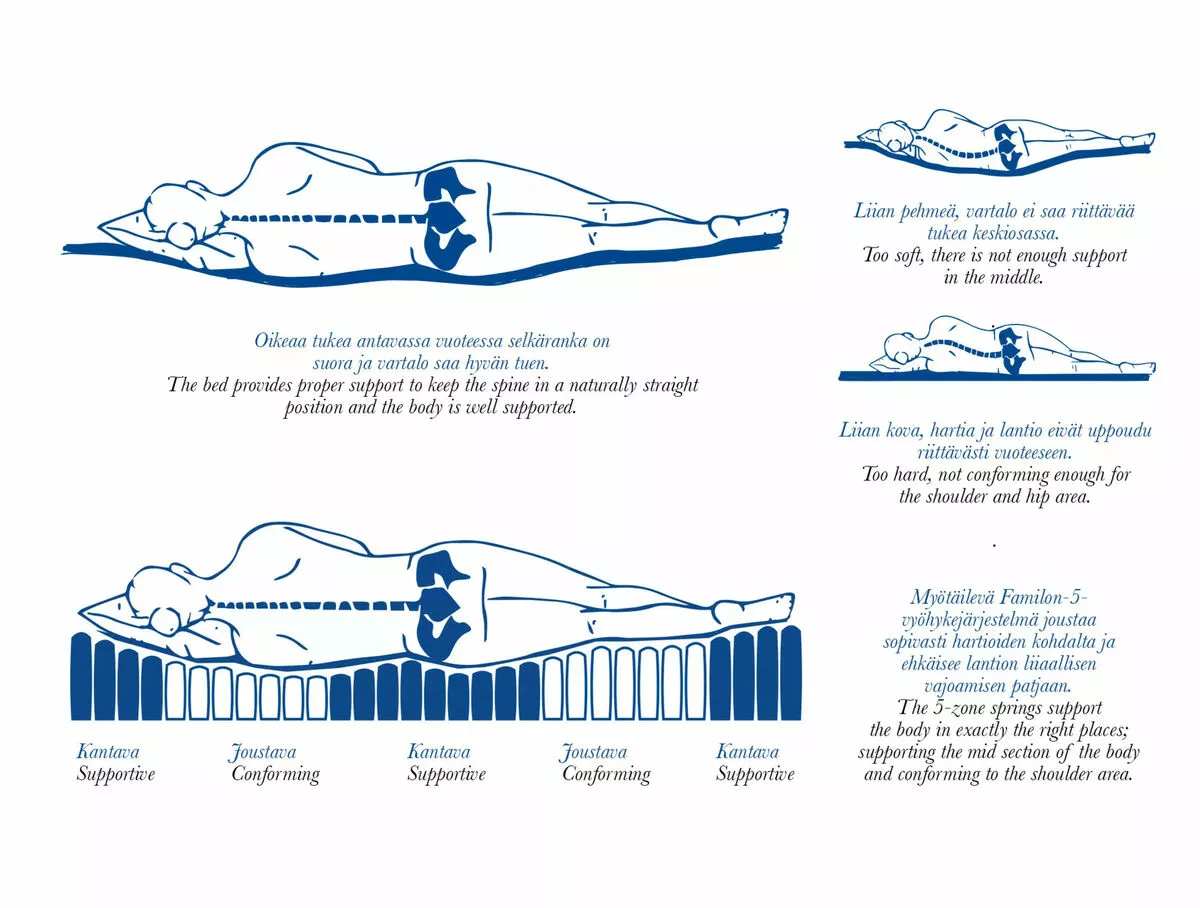 Oikeanlaisen tuen antavassa Familon Zone-vuoteessa selkäranka on luonnollisen suorassa asennossa ja vartalo saa hyvän tuen, näin koko keho rentoutuu ja uni on levollista. Vartaloa tukevan ja myötäilevän Familon Zone joustinsängyn rakenteessa yhdistyvät optimaalisesti myötäilevä 5-vyöhykkeellinen pussijousisto ja entistä tukevampi Bonnel-alajousisto. 5-vyöhykejousisto tukee vartaloa juuri oikeasta kohdasta: keskivartaloa kannattelevasti ja hartiaseudulta myötäilevästi, alajousisto lisää sängyn kestävyyttä ja kannattelevuutta. Vakaan ja kestävän Zone-runkopatjan puurungossa on alla hengittävä ja tukeva sälepohja. Valittavanasi on 3 tyylikästä jalkavaihtoehtoa. 20 cm korkeat jalat ovat altakierrettävät. Kiinnitys on nopeaa eikä työkaluja tarvita.