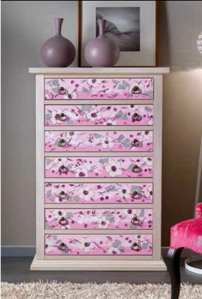 Italialaisen La Casa-tuotesarjan värikäs senkki kauniilla kuvioiduilla vetolaatikoilla. Kauniissa lipastossa on yhteensä 7 vetolaatikkoa.