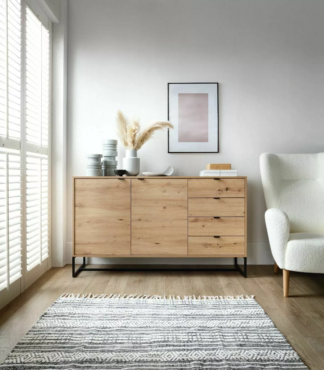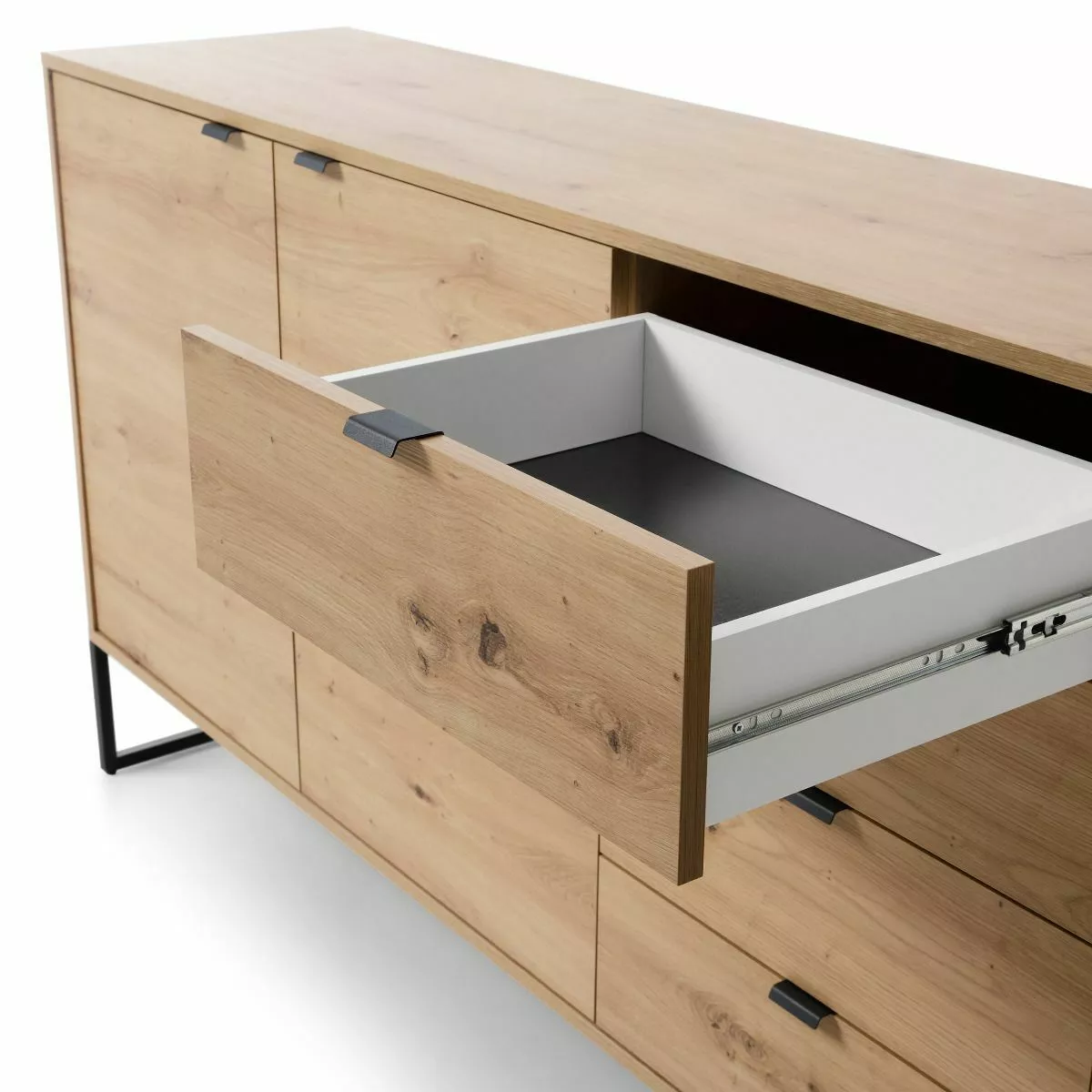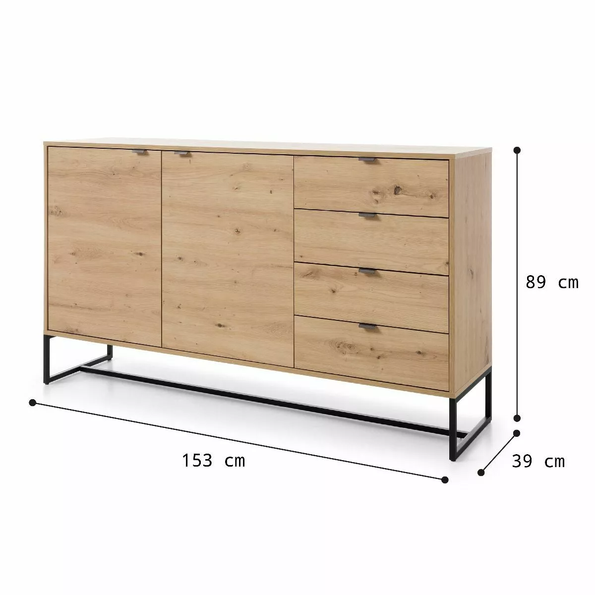 Tyylikäs tammen värinen Fore-senkki. Senkissä on 16 mm laminoitu kalustelevyrunko, ABS-reunanauha, mustat metallijalat sekä mustat metallivetimet. Senkki sisältää neljä vetolaatikkoa sekä kaksi kaappia, joissa molemmissa on välihylly.