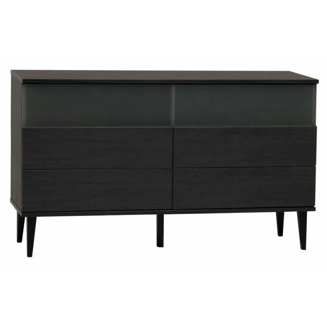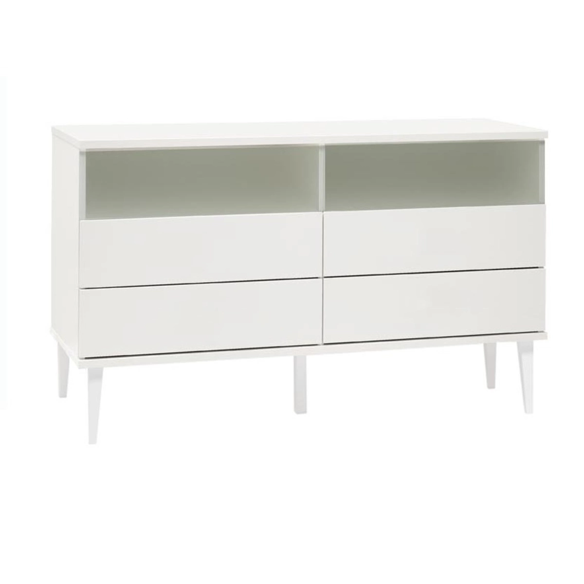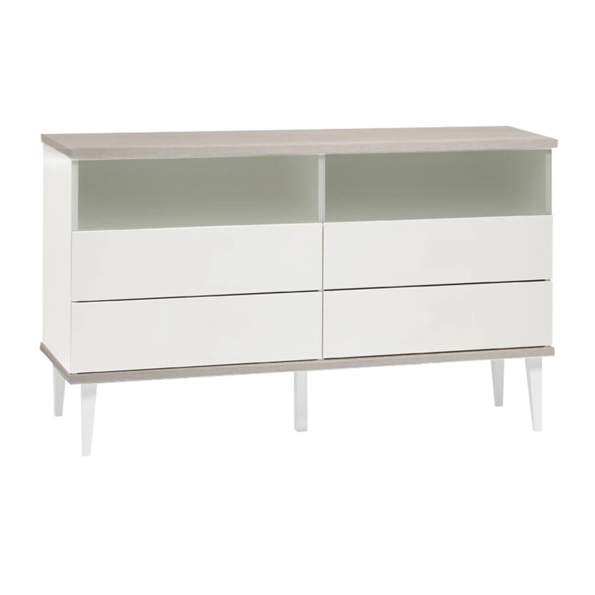 Taiga 5.6 senkissä on 4 tilavaa vetolaatikkoa sekä 2 avotasoa. Laatikot avautuvat push-open ponnahdusmekanismilla. Laatikoiden etulevyjen yläreunaan on upotettu himmeät maitolasit, jotka liukuvat laatikoiden mukana ja peittävät tason avonaisen ylähyllyn laatikon ollessa kiinni.Taiga 5.6 senkki on myös erinomainen valinta tv-tasoksi olohuoneeseen!