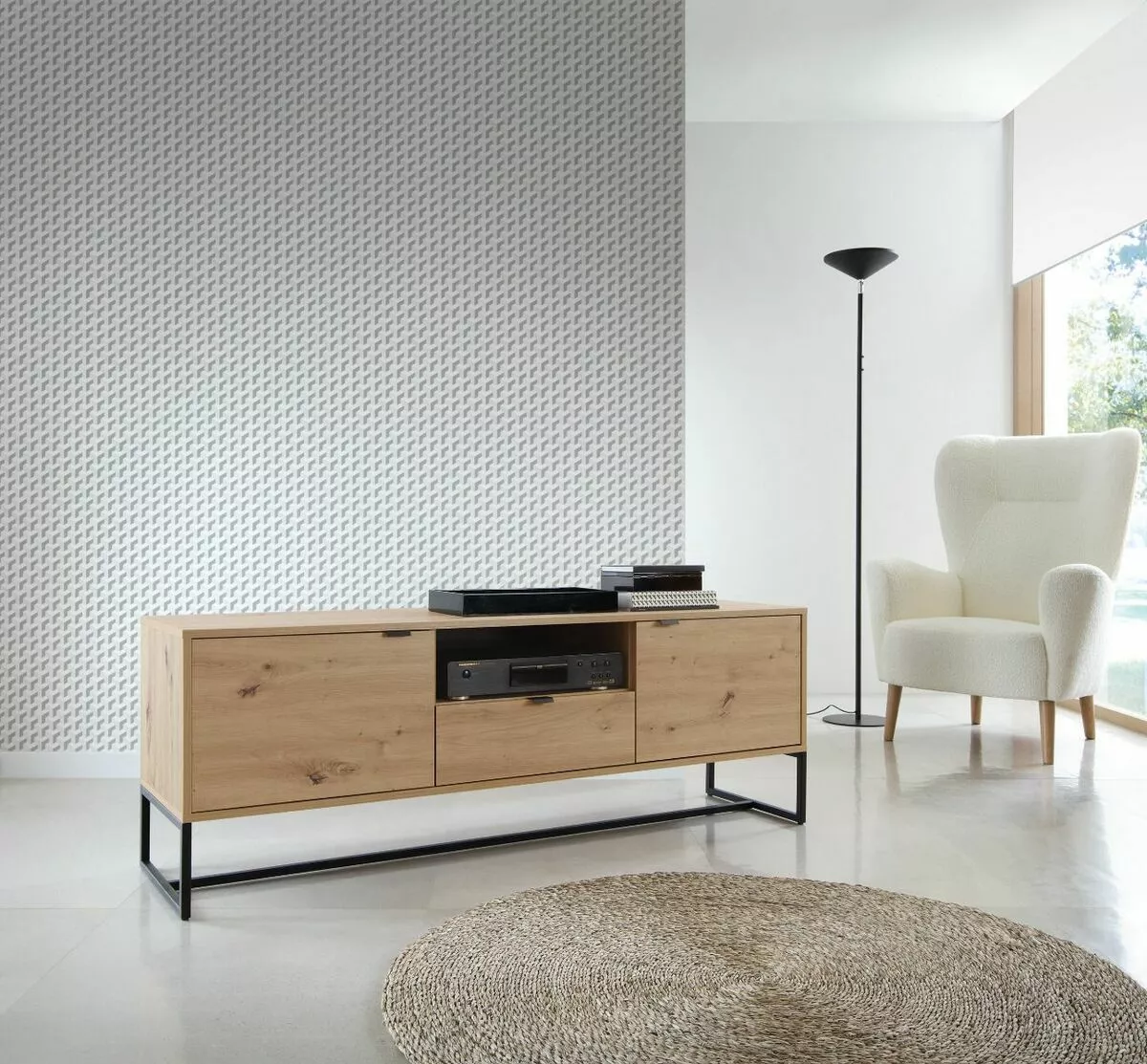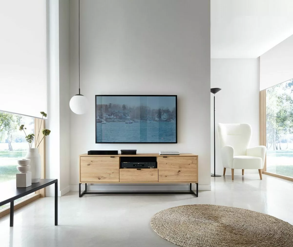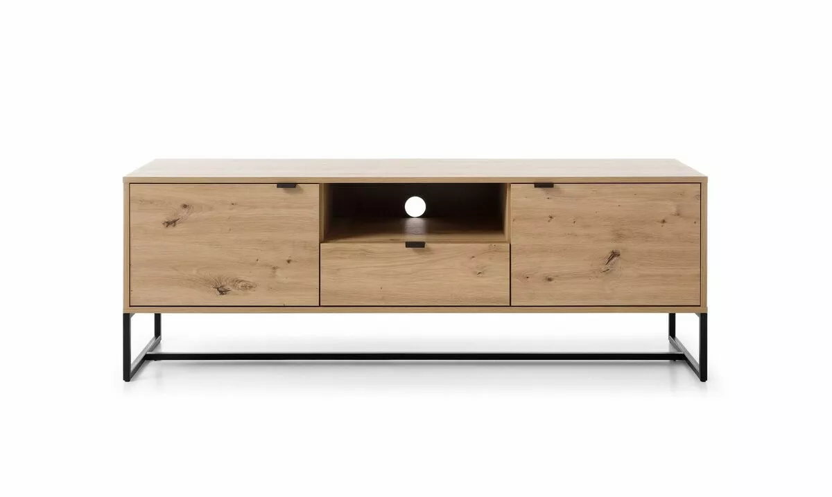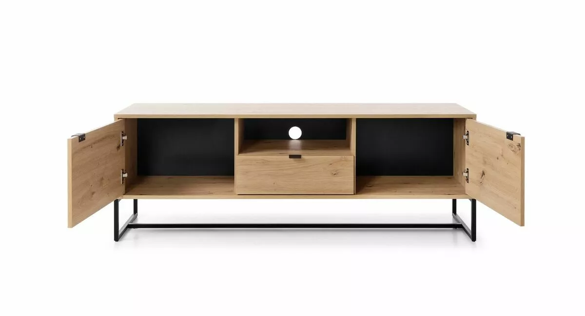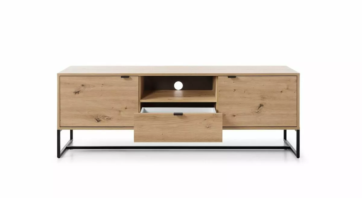 Tyylikäs tammen värinen Fore tv-taso. Tv-tasossa on 16 mm laminoitu kalustelevyrunko, ABS-reunanauha, mustat metallijalat sekä mustat metallivetimet. Tv-tasossa on kaksi kaappia, yksi vetolaatikko sekä yksi avohylly.